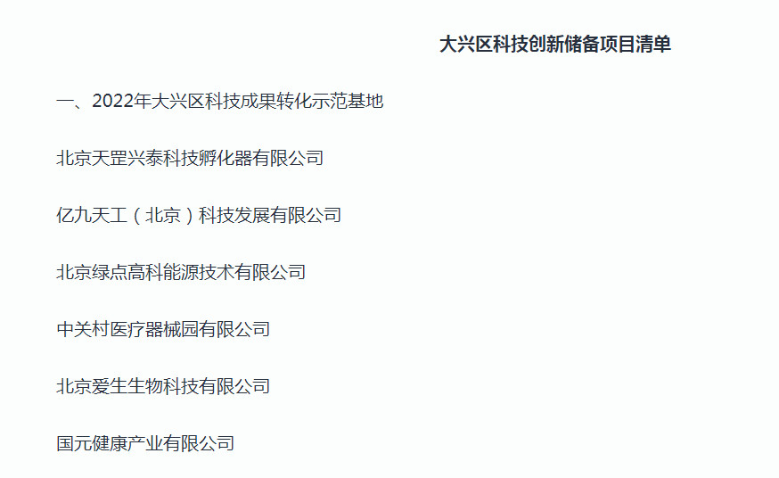 為貫徹落實(shí)《北京市關(guān)于實(shí)施“三大工程”進(jìn)一步支持和服務(wù)高新技術(shù)企業(yè)發(fā)展的若干措施》工作要求,優(yōu)化科技創(chuàng)新環(huán)境,加快塑造發(fā)展新動(dòng)能,推動(dòng)科技創(chuàng)新引領(lǐng)區(qū)建設(shè),大興科委面向全區(qū)開(kāi)展了年度優(yōu)秀科技企業(yè)孵化器、科技創(chuàng)新優(yōu)秀企業(yè)、新技術(shù)新產(chǎn)品(新服務(wù))優(yōu)秀企業(yè)、技術(shù)交易合同登記優(yōu)秀企業(yè)和2022年科技成果轉(zhuǎn)化示范基地、國(guó)高新企業(yè)“小升規(guī)”優(yōu)秀企業(yè)征集儲(chǔ)備工作。北京愛(ài)生生物科技有限公司被納入《大興區(qū)科技創(chuàng)新儲(chǔ)備項(xiàng)目清單》,“愛(ài)生生物治療科技成果轉(zhuǎn)化示范基地”被大興區(qū)科委確定為2022年大興區(qū)科技成果轉(zhuǎn)化示范基地。